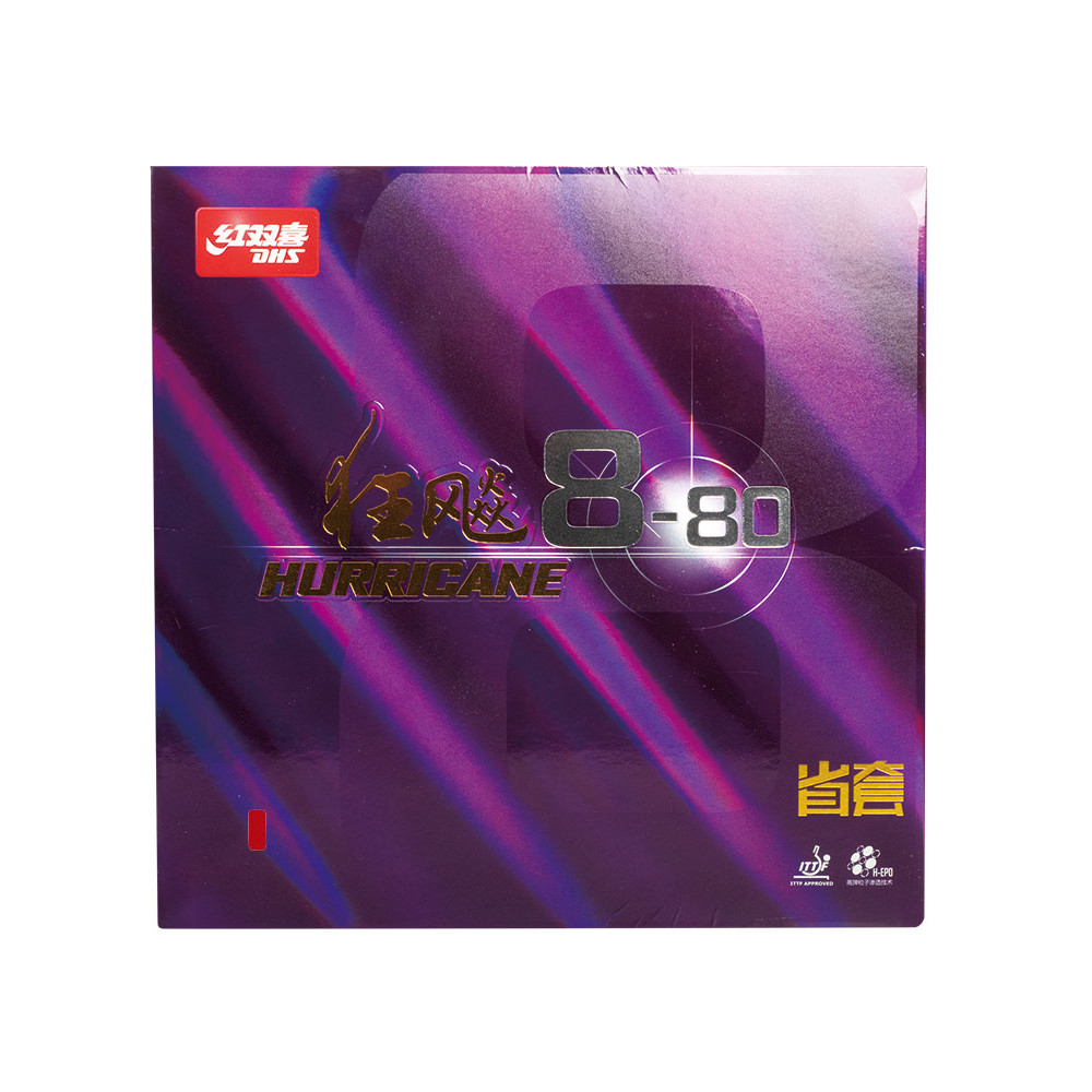DHS Hurricane 8-80 37° a 38° je potah s vyváženou rychlostí a kontrolou, s vysoce elastickou houbou č. 80 a příjemější na dotek. DHS Hurricane 8-80 je lehčí a elastičtější, má přilnavý povrch, je vhodný pro forhend i backhand.